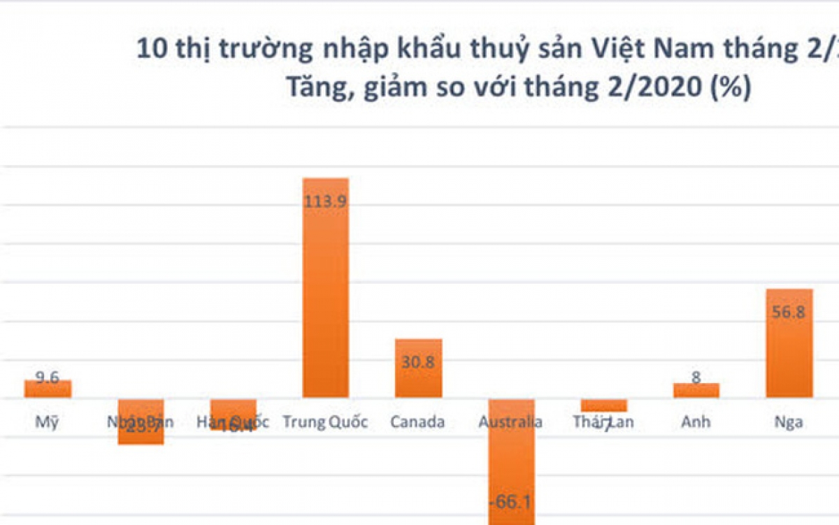 Tuy nhiên, xuất khẩu đang có chiều hướng phục hồi vì giá trị xuất khẩu sang nhiều thị trường tăng mạnh. Top 10 thị trường đơn lẻ có kim ngạch nhập khẩu thủy sản từ Việt Nam cao nhất trong tháng 2 gồm: Mỹ, Nhật Bản, Hàn Quốc, Trung Quốc, Canada, Thái Lan, Anh, Nga, và Hà Lan, chiếm đến 75,4% tổng xuất khẩu thủy sản của Việt Nam.