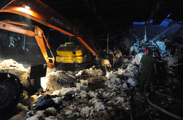 Khoảng 21h tối 23/7, khi đám cháy cơ bản được khống chế thì đến khoảng 0h ngày 24/7, hàng trăm người tham gia chữa cháy cùng 5 xe cứu hỏa, 3 xe múc cở lớn và khoảng 5 xe nâng lại tiếp tục căng mình chiến đấu với “giặc lửa” liên tục cho đến khoảng 7h sáng 24/7.