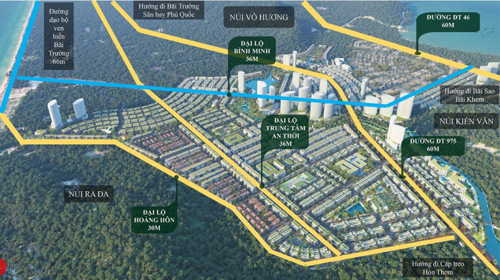Trục đại lộ DT46 (đường Nguyễn Văn Cừ) song song với DT 975 (Đường Bào). Trục đường này nối sân bay quốc tế với cực Nam của Phú Quốc - Hòn Thơm.
