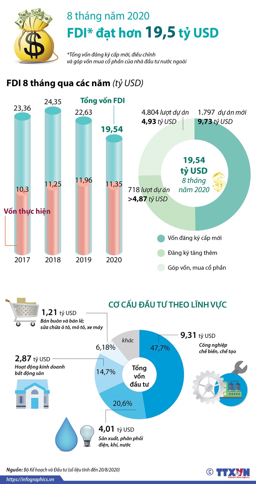 Tính đến ngày 20/8/2020, tổng vốn đăng ký cấp mới, điều chỉnh và góp vốn mua cổ phần của nhà đầu tư nước ngoài đạt 19,54 tỷ USD, bằng 86,3% so với cùng kỳ năm 2019.