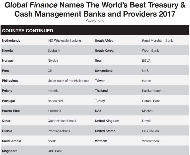 Danh sách bình chọn các ngân hàng tốt nhất về quản lý tiền mặt và kinh doanh vốn tại các quốc gia do Global Finance công bố