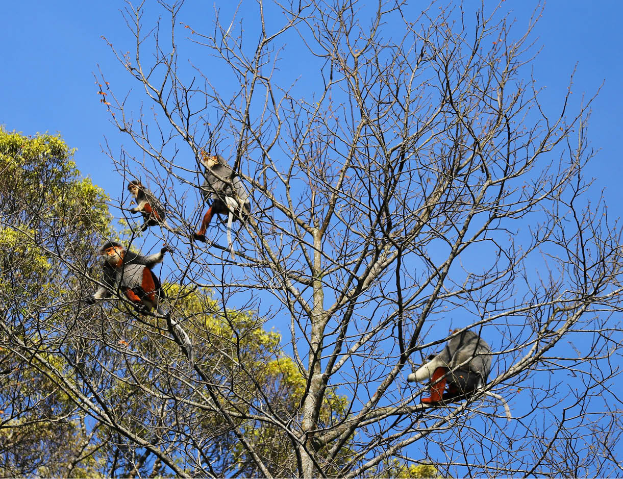 Một thời do tác động của con người như nạn phá rừng, săn bẫy thú thường xuyên diễn ra nên số lượng cá thể voọc chà vá chân nâu xuất hiện tại núi Bạch Mã giảm đáng kể. Trong vài năm trở lại đây, nhờ bảo vệ rừng hiệu quả, nạn săn bẫy thú giảm nên cá thể voọc ngũ sắc xuất hiện ngày càng nhiều. Trong số 12 đàn với 128 cá thể voọc ngũ sắc sinh tồn ở rừng Bạch Mã, riêng tại núi Bạch Mã ghi nhận có đến 6 đàn với 85 con.