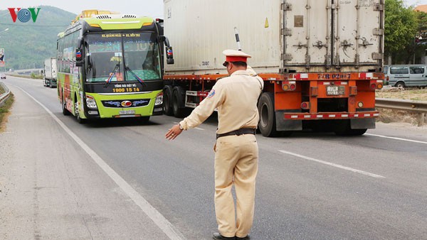 Cảnh sát giao thông - Công an tỉnh Bình Định kiểm tra xe khách trên quốc lộ 1A