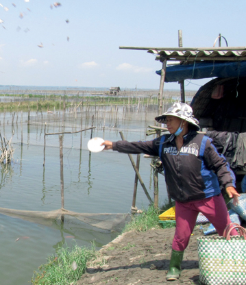 “Bây giờ thì ổn rồi, chứ từ 1985 cho đến tận những năm đầu của thập kỷ 1990, có những người như bác Phương đấy, được các cấp, các ngành quan tâm, hỗ trợ đấy, nhưng anh em cán bộ tại chỗ của Quảng Công chúng tôi cũng vô cùng gian nan vất vả. Vận động bà con chuyển đổi đất nông nghiệp năng suất thấp sang nuôi trồng thuỷ sản, lấn phá đắp hồ để thả tôm nuôi là không hề đơn giản. Phải đi từng ngõ, gõ từng nhà, động viên, thuyết phục, còn phải làm mẫu trước nữa thì bà con mới tin. Nay thì không cần nói bà con cũng vẫn ngày đêm bám hồ.”-anh Thưởng kể. Như để minh chứng, lúc anh Thưởng vừa dứt lời cũng là lúc chúng tôi gặp chị Lê Thị Khoa. Vợ chồng chị Khoa bước vào nghề nuôi thuỷ sản tính đến nay đã là hai mươi năm có lẻ. Những năm trước vợ chồng chị nuôi tôm sú, chừng 4-5 năm lại đây chuyển sang nuôi cá, còn tôm chỉ nuôi với số lượng rất tượng trưng. Chồng chị, anh Phạm Thanh Việt có đôi tay không được lành lặn nhưng lại là một người nuôi trồng thuỷ sản cự phách của cả Quảng Công này. Hai vợ chồng đang sở hữu 4 hồ nuôi với diện tích 1ha. Anh nay chủ yếu làm “cố vấn”, “bàn giao” hồ cho chị Khoa và cậu trai út 19 tuổi có cái tên rất… dễ thương: Phạm Kim Vi Vi. Lúc chúng tôi đến, chị Khoa đang dở tay chuẩn bị thức ăn cho cá. Đó là những con cá trích to cỡ bàn tay trẻ con. Đầu, đuôi và phần bụng được cắt riêng. Phần thân bỏ riêng. “Đầu đuôi nhiều xương, ném thẳng cho cá to nó ăn. Phần thân phải đem xay nhuyễn, cá nhỏ mới ăn được”-Chị Khoa giảng giải. Mỗi ngày cho ăn 1 lượt, nhưng 4 hồ cá của chị Khoa cứ bình bình ngốn 2,5 tạ cá tươi một ngày. Tính thành tiền, riêng thức ăn cho cá đã là 2,5 triệu đồng, mỗi năm “bay mất” cả tỷ bạc như chơi. Cá nuôi chừng 1 năm đến 13 tháng thì xuất bán. Mỗi năm 7-8 tấn. Các nậu tìm về tận nơi cân mua. Giá dao động tuỳ thời điểm, mỗi kg từ 80-130 ngàn đồng. Trừ chi phí, chị Khoa cho hay chị cũng kiếm được chừng vài ba trăm triệu. Dõi theo cậu con trai Vi Vi, chị trìu mến: “Nó siêng năng giỏi giắn nổi tiếng ở đây đó. Thanh niên nhưng không đi chơi đâu cả, cứ đeo mấy con cá suốt ngày. Sáng sớm dậy là lo nấu nồi cháo cám cho cá nhỏ ăn. Rồi lại xoay ra chăm lũ cá to. Tối nửa đêm còn soi đèn kiểm tra. Thấy con cá có dấu hiệu gì bất thường là lo đi hỏi, mua thuốc về chữa trị...”