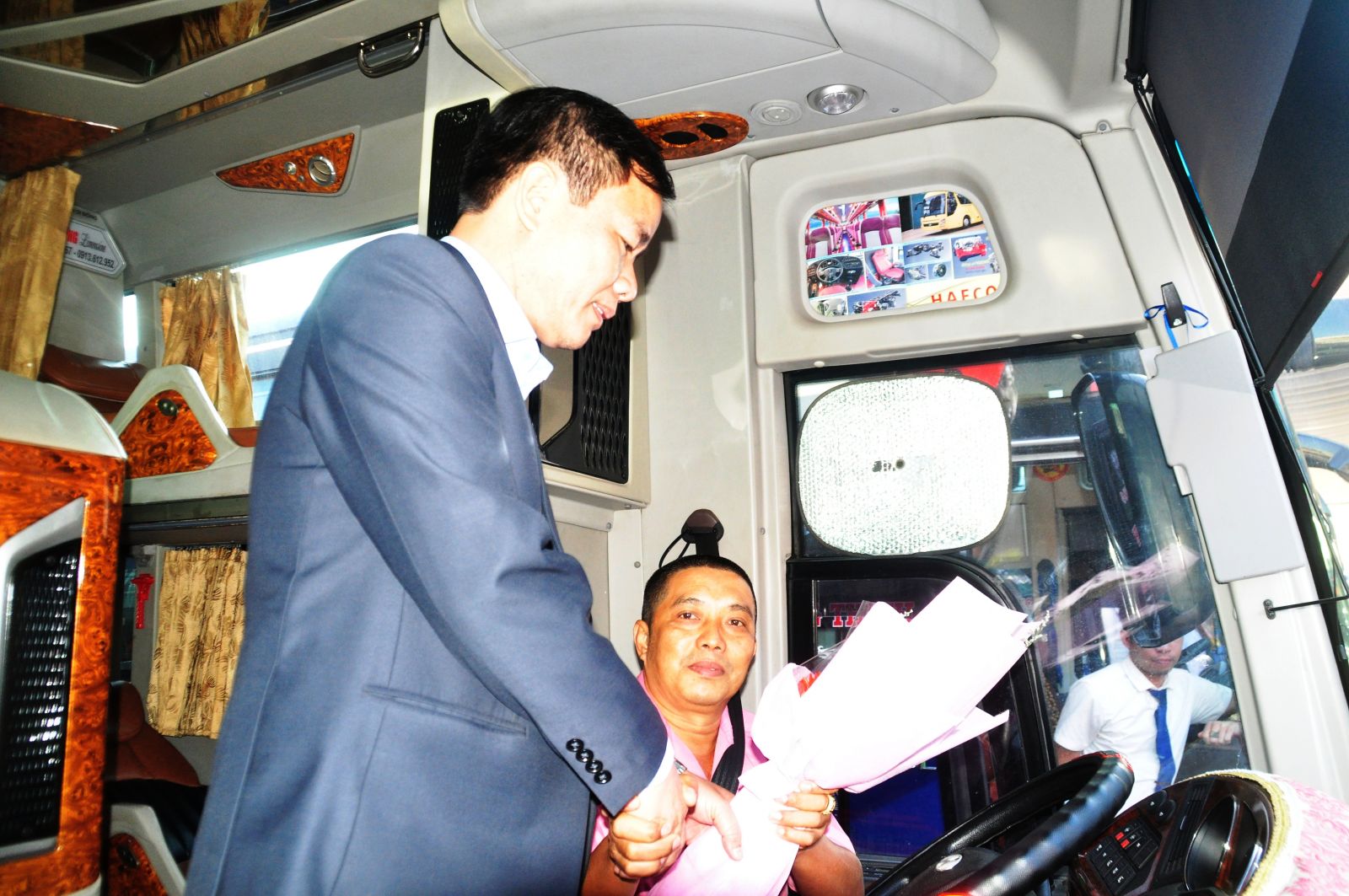 Phó Chủ tịch UBND tỉnh Nguyễn Văn Phương tặng hoa các lái xe nhân ngày đầu ra quân phục vụ tết