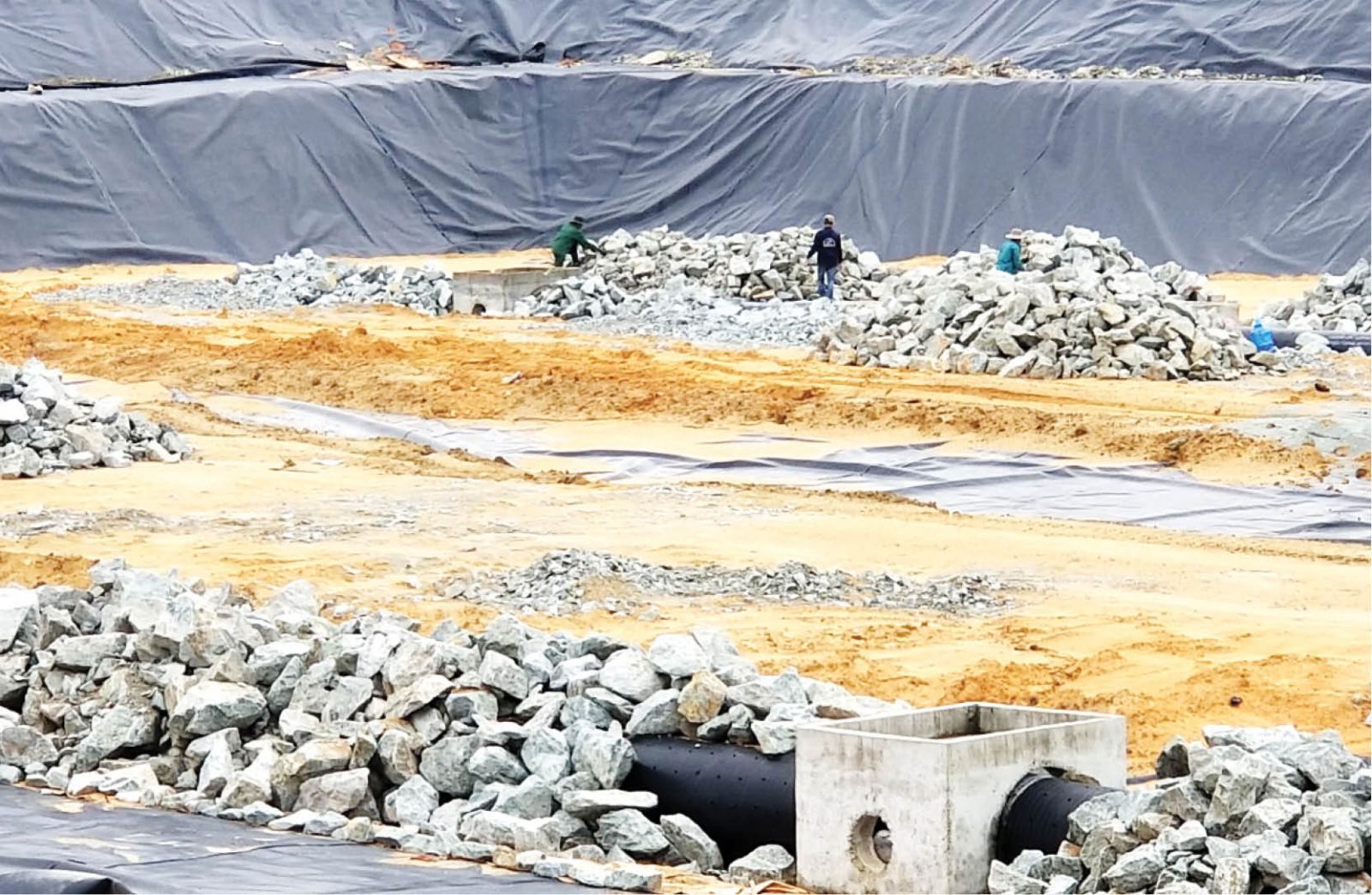 Đến nay, các hạng mục thuộc 2 gói thầu số 19 và 8 tại công trình xử lý rác vẫn còn thi công dang dở. Tuyến đường nội bộ dài khoảng 1km vẫn chưa đổ bê tông hoàn thiện, mương gom nước bề mặt chạy dọc các hố chôn lấp rác bị bồi lấp sau các trận mưa. Hệ thống điện chiếu sáng, bể chứa nước thải, đài cấp nước… đạt khoảng 50-60% khối lượng. Đặc biệt, tại các hố chôn lấp rác được trải màng chống thấm HDPE vẫn còn thi công dang dở, đất cát vùi lấp. Cả công trường chỉ có vài công nhân đang thi công bốc dỡ đá khu vực này.