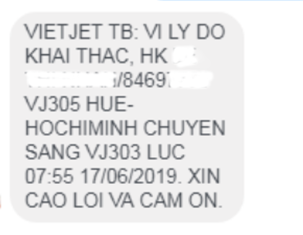 Bà L.T.N vua vé chuyến bay VJ305 từ Huế đi TP. Hồ Chí Minh khởi hành lúc 9 giờ 35 phút sáng 16/6, giá 1.450.000 đồng, nhưng khi chị đến sân bay Phú Bài sáng nay để làm thủ tục bay thì nhận được thông báo bị chuyển sang chuyến bay VJ 303 khởi hành lúc 7 giờ 55 phút sáng 17/6.