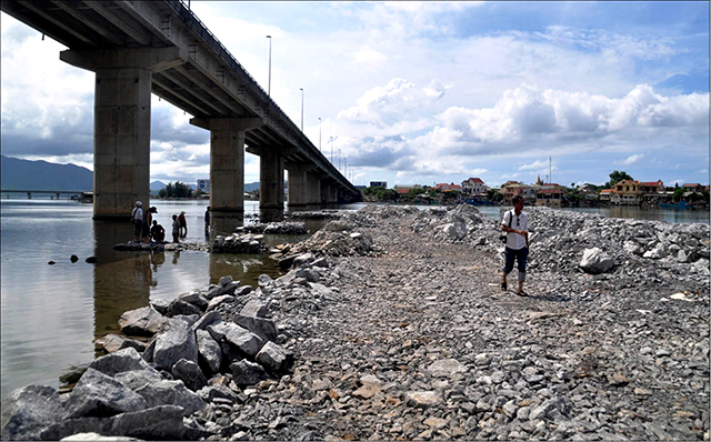 Bà Trương Thị Hoài, người dân làng An Cư Đông 2 cho hay: “Nhiều năm trước, khi xây cầu dẫn vào hầm phía bắc Hải Vân, đơn vị thi công làm đường công vụ bằng đất, đóng xà cừ, họ cam kết sẽ tháo dỡ khi công trình hoàn thành. Khi xong, họ chỉ cho đất ra hai bên gây tắc nghẽn dòng chảy. Bây giờ làm đường công vụ, họ xây bằng đá, bê tông không có cống thoát. Nước bị dồn trước mặt làng, chảy xiết gây sạt lở”.