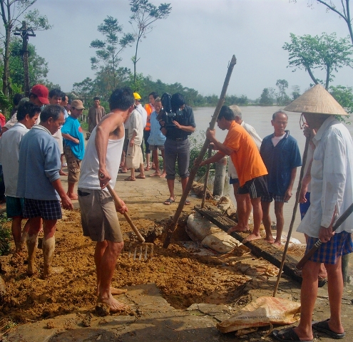 Người dân và chính quyền địa phương xử lý tạm thời đoạn đê Nho Lâm – Nghĩa Lộ bị vỡ