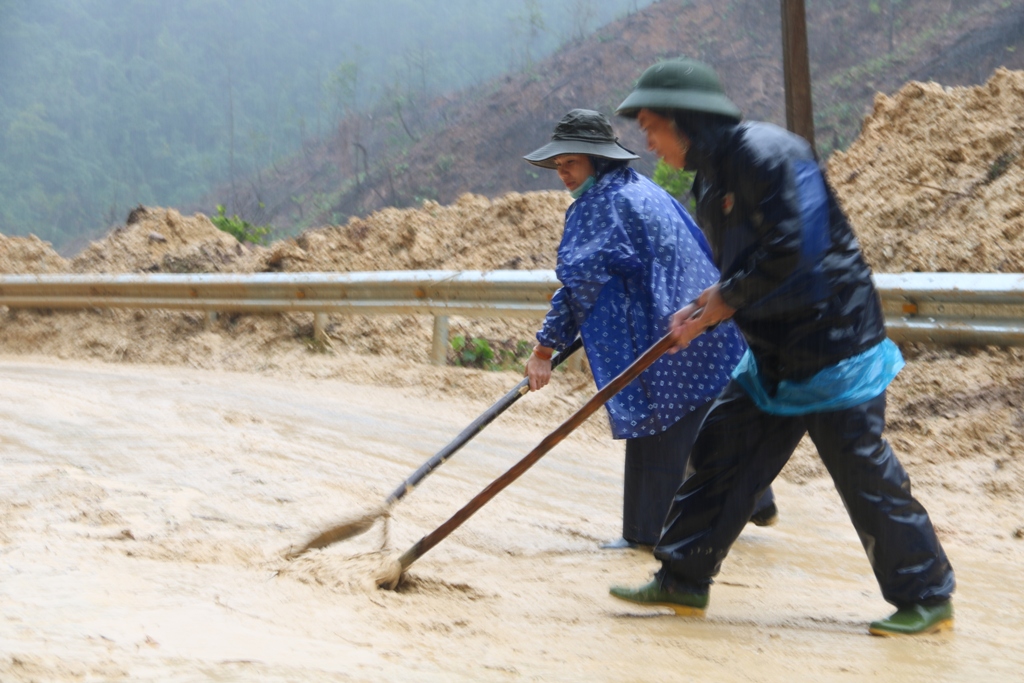 Ngay trong sáng 12/11, trên Quốc lộ 49A xảy ra sạt lở tại điểm Km74+700 và Km75+170 gây tắc đường. Giữa trời vẫn còn mưa, các lực lượng chức năng huy động nhân lực, phương tiện căng mình khắc phục sự cố, nỗ lực thông đường.