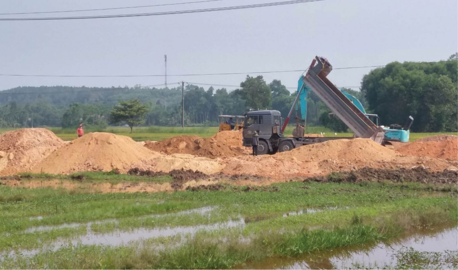 Tuy nhiên, việc cào bóc, xử lý lớp đất bề mặt ruộng tại đây không được đơn vị thi công thực hiện mà tiến hành cho đổ đất san nền lên đất ruộng khiến nghi ngại về chất lượng nền của các lô đất nằm trong khu TĐC này. Đất san lấp chở về khu vực này cũng lẫn nhiều đá lớn, rễ cây, quá trình vận chuyển đất san lấp gây ô nhiễm môi trường trên tuyến QL49, nhiều phương tiện chở đất dấu hiệu quá tải…