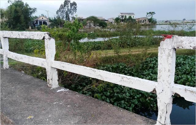 Phần lan can Cầu Long (xã Phú Mỹ, huyện Phú Vang) bị gãy đổ rất nguy hiểm cho người đi đường