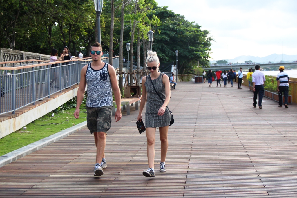 Du khách nước ngoài dạo trên cầu đi bộ lát gỗ lim dọc sông Hương