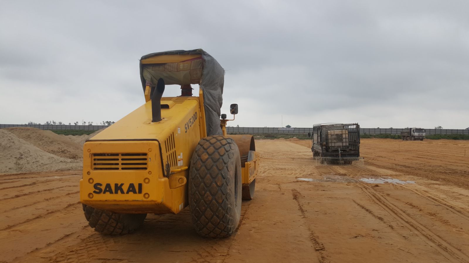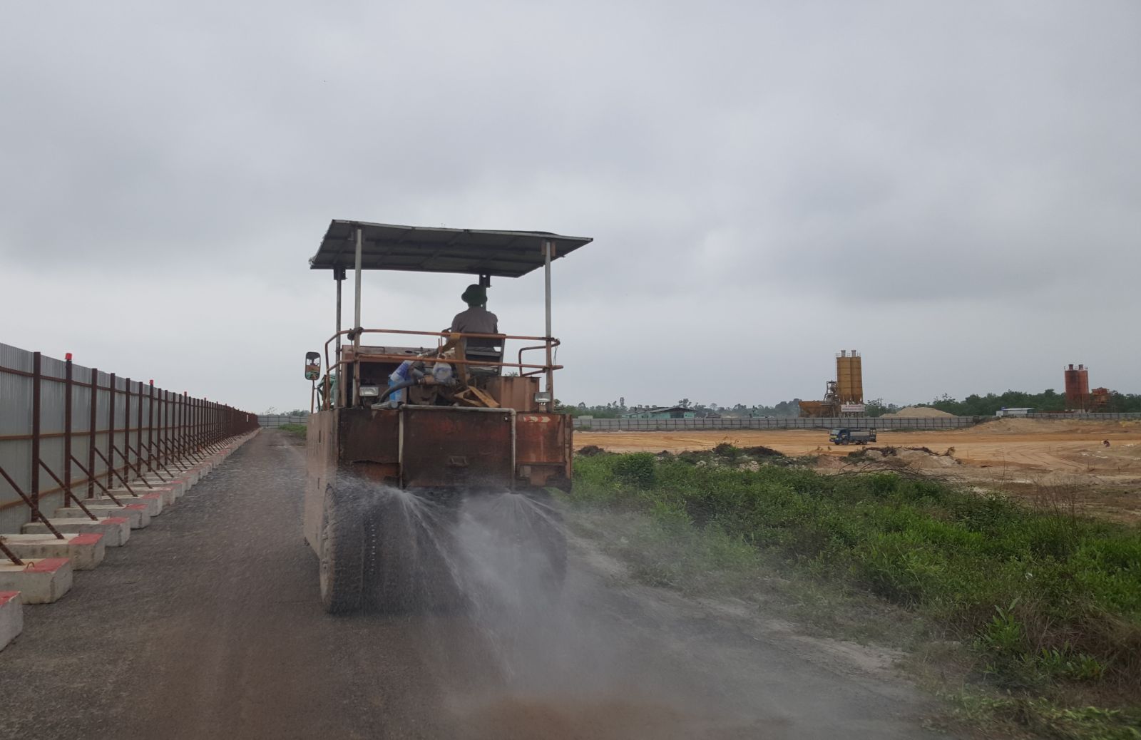 Xe tưới nước hỗ trợ cho xe lu nén cho mặt nền theo thiết kế bê tông cốt thép dày 38cm
