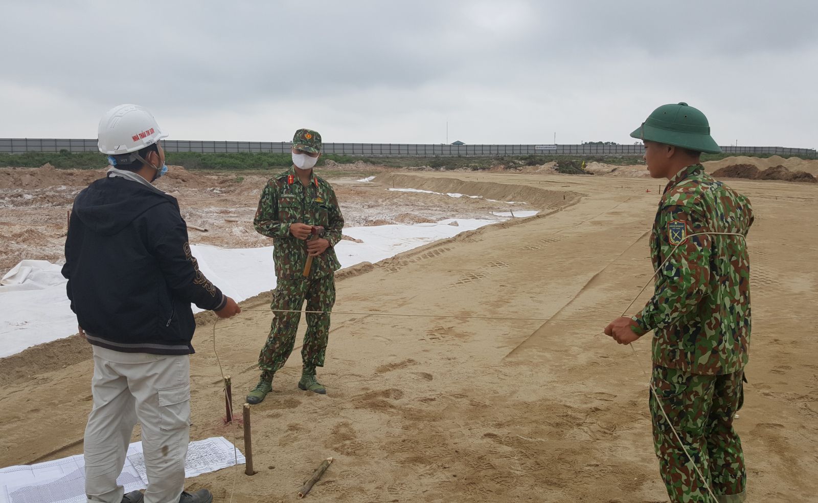 Các chiến sĩ được nhà thầu mời gọi tham gia hỗ trợ định vị, cắm mốc phân ranh giới từng hạng mục cho công trình