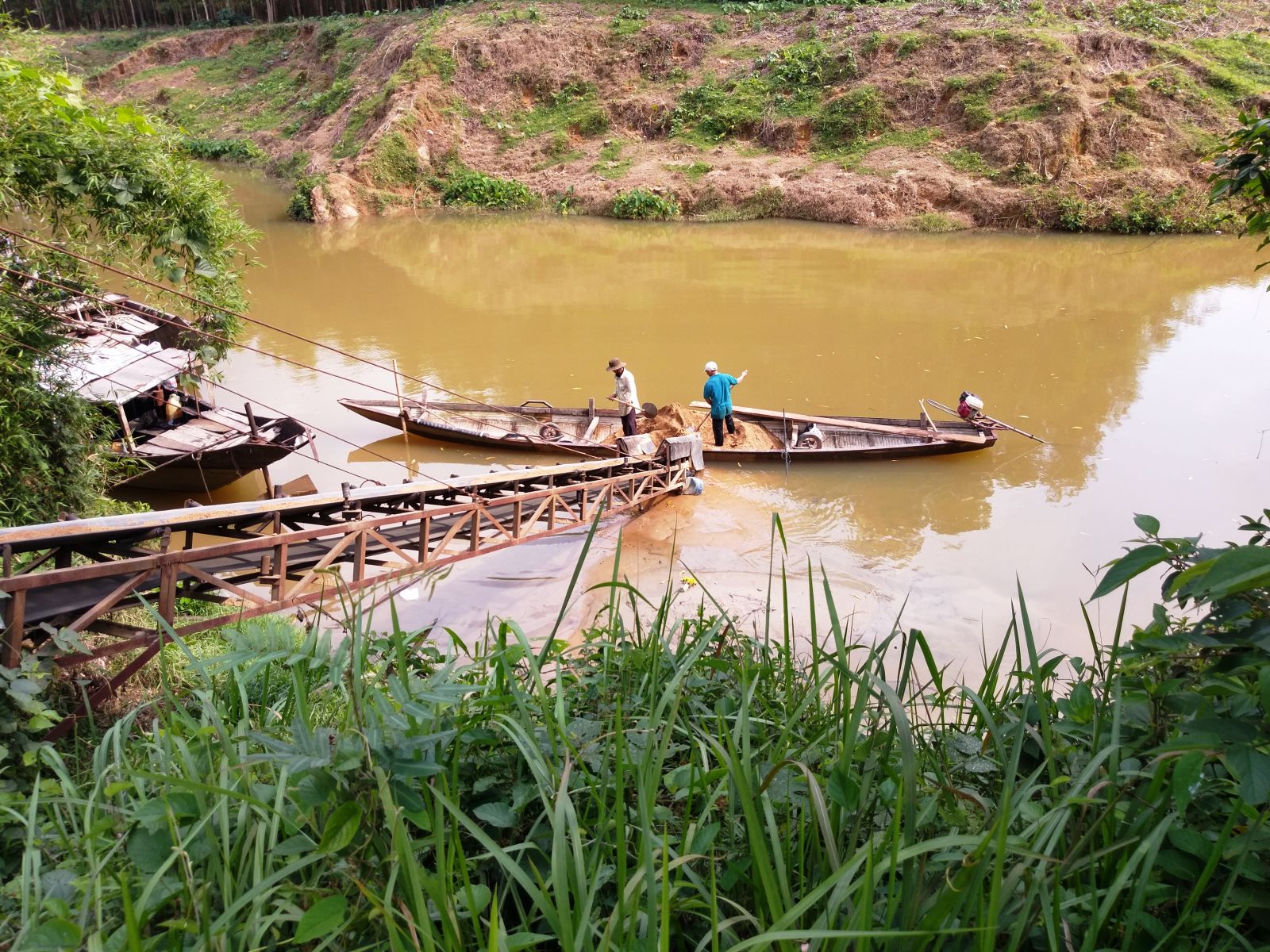 "Đánh" cát từ dưới sông lên bằng băng chuyền (ảnh chụp ngày 28/2)