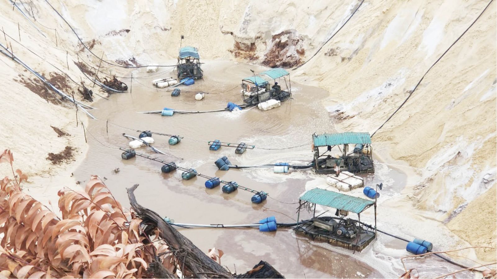 Ngay từ đầu tuyến, hiện trạng trên cả nghìn m2 đơn vị này đang bố trí các máy hút nằm sâu dưới hố cát, trên bờ nhiều vít xoắn, đang khai thác titan tại đây. Khu vực khai thác nằm khá sát tuyến đường TĐC và được đóng cọc, rào chắn bằng tôn, bố trí người bảo vệ.