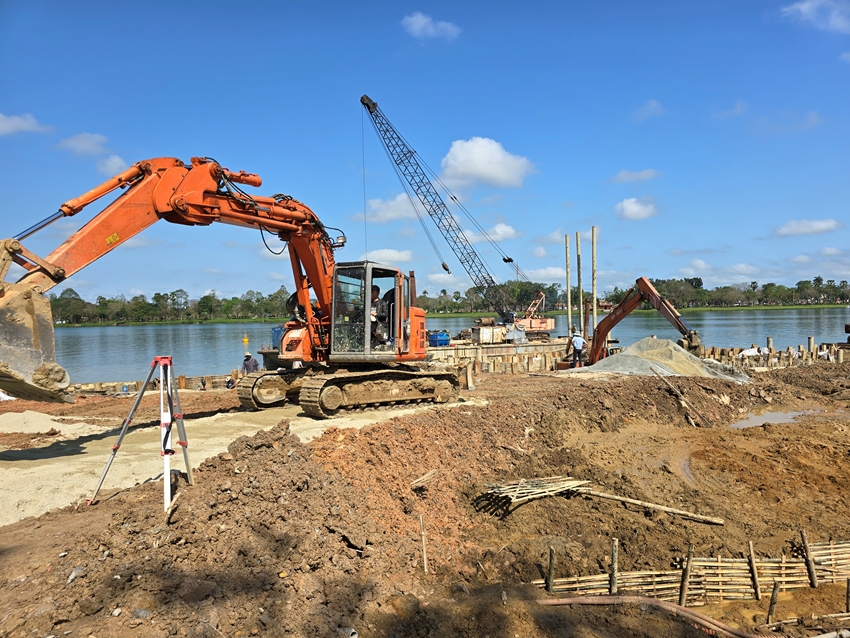 | Dự án sân khấu ngoài trời kết hợp đường dạo dọc bờ nam sông Hương đang được các đơn vị thi công đẩy nhanh tiến độ |
