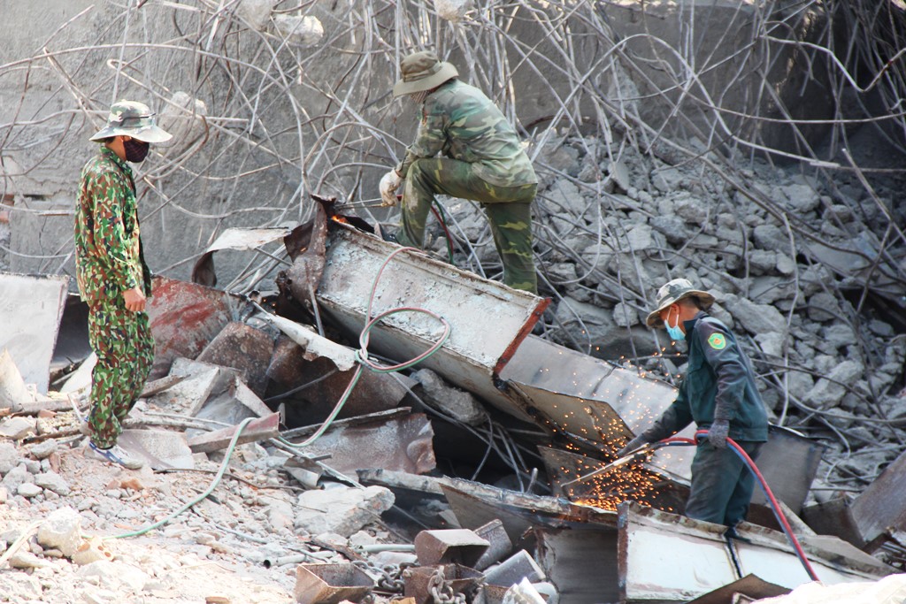 Các toà nhà bị đánh sập, công nhân tiến hành cưa lấy khung sắt