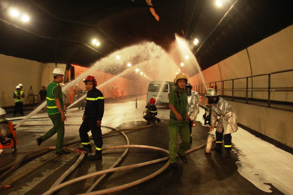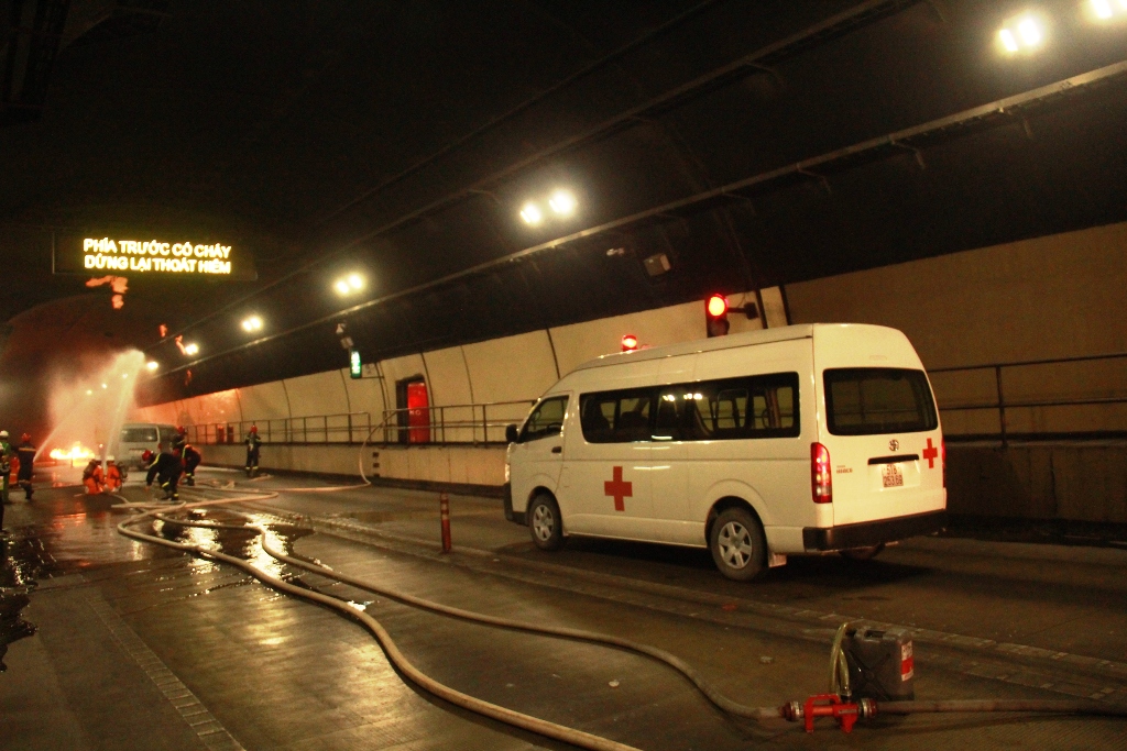 Theo đó, tình huống giả định: Có một xe tải trọng 9 tấn lưu thông hướng Bắc - Nam trong hầm. Khi đến vị trí cách cửa hầm phía Nam 2km thì nổ lốp, xe đâm vào lan can trước khi lật. Cùng lúc, có một xe khách chở theo 10 người từ phía sau do không giữ khoảng cách đã tông vào xe tải. Cú va đập khiến thùng nhiên liệu bị vỡ gây cháy lớn, nhiều người trên xe bị thương, khói tỏa kín hầm.