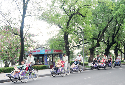 Khách du lịch nước ngoài thích thú khi ngồi xích lô dạo phố trên những tuyến đường rợp bóng cây xanh