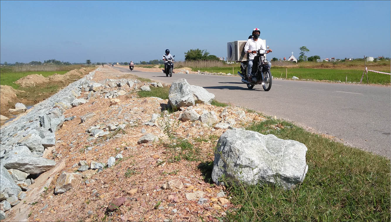 Bờ kè đá hai bên cơ bản đã hoàn thành trên chiều dài gần 3km. Tuy nhiên, một số điểm nằm ở giữa đoạn đường nâng cấp, mở rộng vẫn chưa được kè.