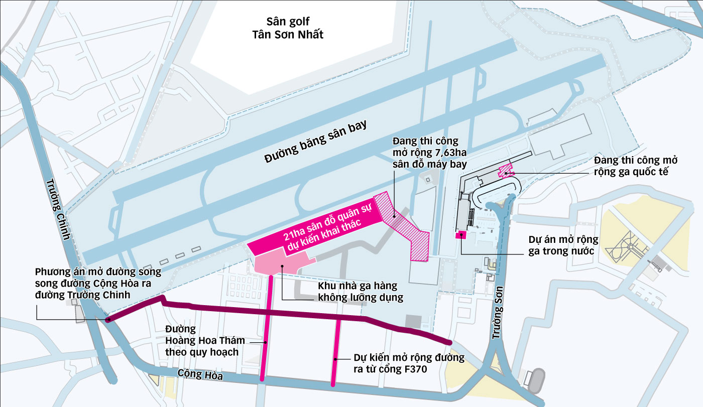 Sơ đồ dự kiến phương án mở rộng đường lăn, sân đỗ máy bay và đường song song đường Cộng Hòa ra hướng đường Trường Chinh