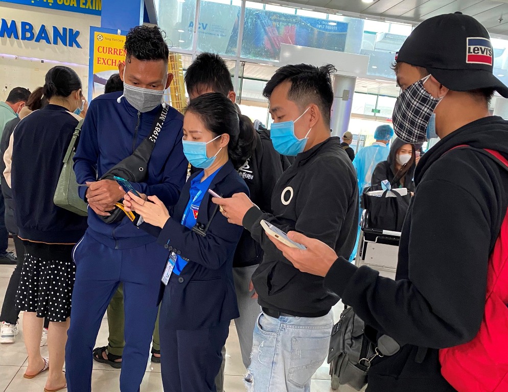 Lực lượng tình nguyện viên giúp hành khách khai báo y tế tại cảng HKQT Phú Bài