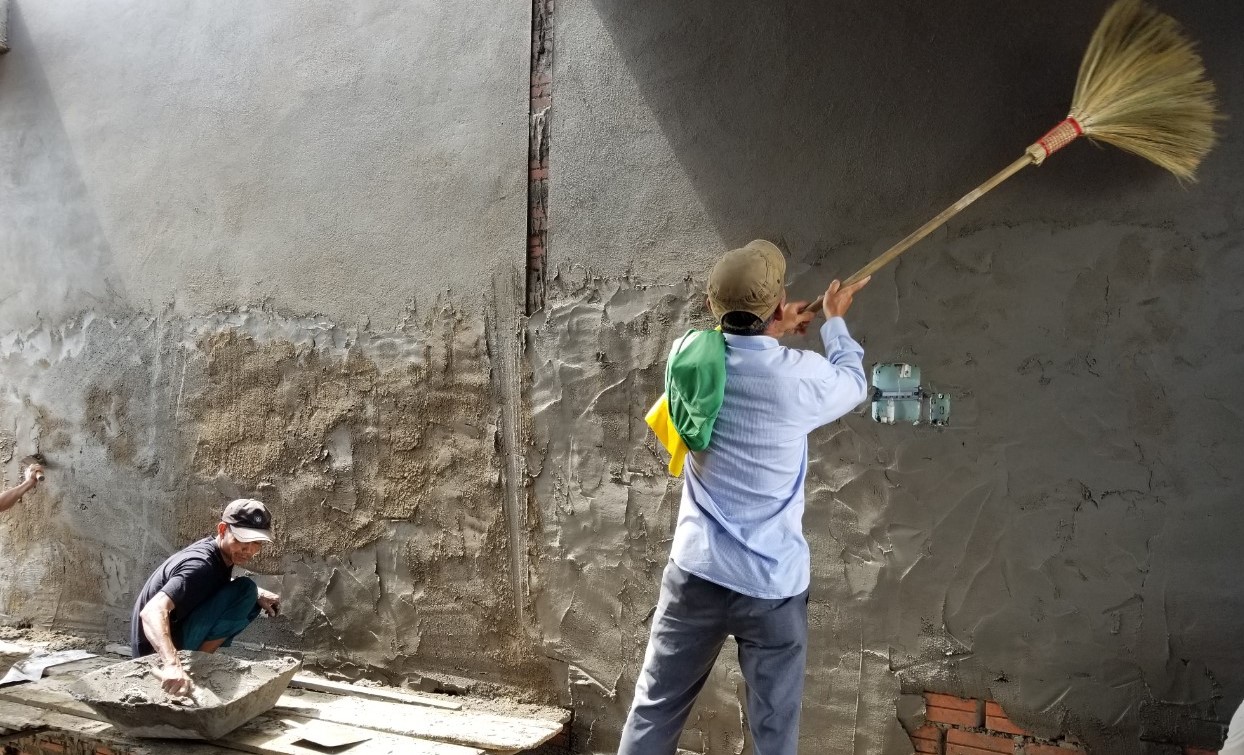 Trong trường hợp vữa bị khô thì dùng chổi đót thấm nước quét nhẹ lên mặt tường