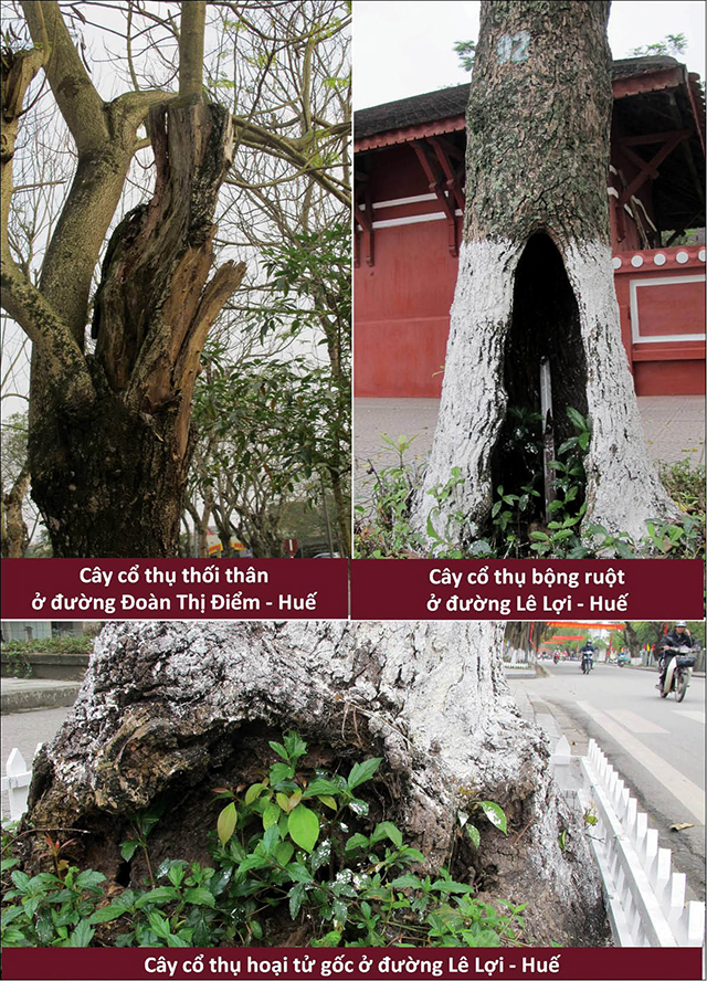 Về giải pháp kỹ thuật: Cơ quan quản lý cây xanh cần cử cán bộ chuyên trách thường xuyên thăm khám để kịp thời phát hiện những tổn thương hoặc những nguy cơ đe dọa sự sinh trưởng của cây xanh nhằm có biện pháp khắc phục kịp thời; cắt tỉa tạo tán định kỳ, chọn thời điểm cắt tỉa phù hợp (không phải chỉ để đối phó với gió bão) để không những không làm mất sức sống mà còn kích thích cây đâm lộc, nảy cành mạnh mẽ; cắt tỉa tạo tán phải đúng kỹ thuật, cắt tỉa xong phải trám bít vết cắt bằng vật liệu thích hợp để tránh đẫm nước gây thối vết cắt tạo điều kiện cho các tác nhân gây hại (vi nấm, vi khuẩn, rêu, tảo) xâm nhập gây thối cành, hỏng thân, bọng ruột, làm giảm tuổi thọ cây, thậm chí gây chết cây hoặc khiến cây dễ gãy đổ khi gặp gió chướng; đối với những cây cổ thụ đồ sộ, cần phải hạ chiều cao, thu gọn tán, mở họng cho gốc, cắt tỉa rễ nổi, thay đất, bón thúc phân; xóa bó vỉa bê tông chung quanh hố trồng cây, thay vào đó là đậy hố gốc cây bằng những tấm vật liệu thấm nước thông khí, tốt nhất là loại bê tông xuyên nước (chẳng hạn như mẫu của Trường ĐH Bách khoa Đà Nẵng đã thử nghiệm ở TP. Đà Nẵng). Thực hiện kỹ thuật này sẽ làm cho gốc cây không bị tấp rác, đồng thời nước mưa dễ thấm vào rễ cây và rễ cây dể hấp thu không khí từ bên trên lan tỏa xuống một cách tự nhiên, hơn thế nữa là làm tăng diện tích bề mặt vỉa hè, từ đó vỉa hè cũng thông thoáng, sạch sẽ hơn; tuyệt đối không để việc thi công lắp đặt các công trình hạ tầng kỹ thuật ngầm gây tổn thương gốc cây hoặc hủy hoại hệ thống rễ cây. Khi thực hiện trồng thay thế hoặc trồng mới cây xanh đường phố cần chọn loài thích hợp, cây đưa trồng phải đảm bảo có bộ rễ tối thiểu, không bịn cắt gọt hết rễ cọc (tối thiểu phải chừa lại một phần đoạn sinh trưởng) để sau này cây có bộ rễ ăn sâu vừa đảm bảo về sinh lý dinh dưỡng, vừa phát huy vai trò gắn bám cơ học giúp cây sinh trưởng khỏe và chống chịu tốt với gió bão…