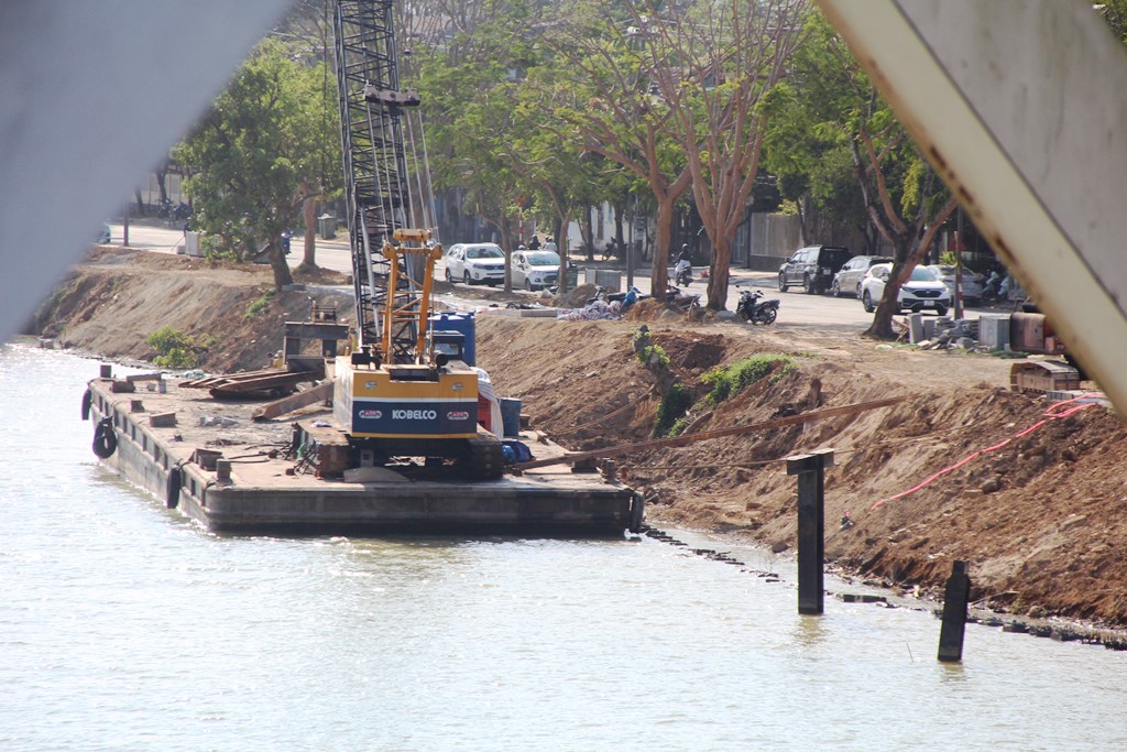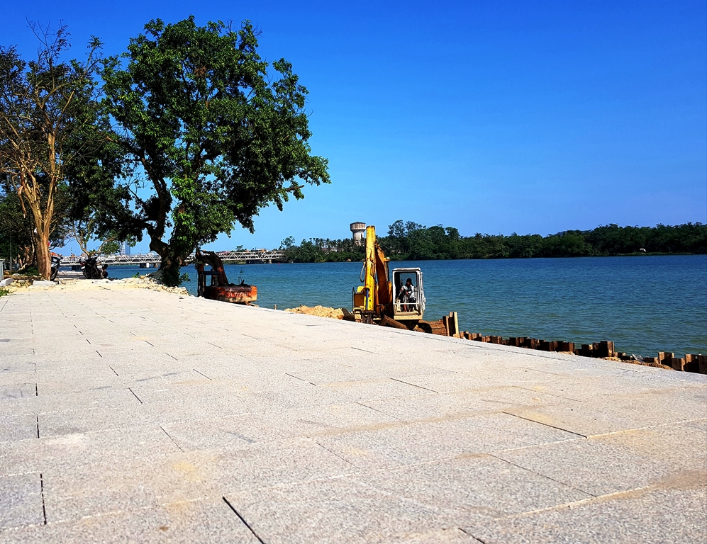Bên cạnh thi công tuyến đường đi bộ, việc làm kè dọc theo bờ sông Hương để chống sạt lở vào mùa mưa bão cũng được thực hiện ráo riết
