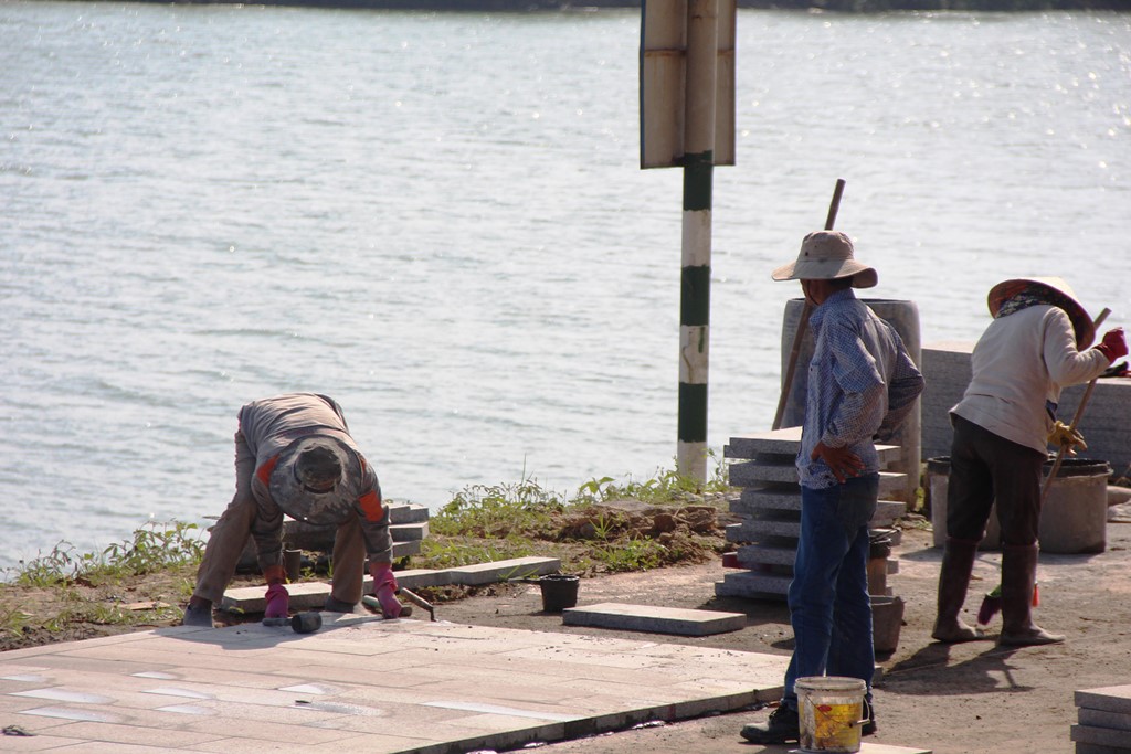 Theo quan sát của chúng tôi, song song với việc thi công ốp đá cho đường đi bộ ở phía trên, thì ở phía dưới mặt tiếp giáp với bờ sông việc làm kè chống sạt lở cũng được thực hiện một cách ráo riết. Quá trình thi công được triển khai một cách nghiêm túc với những nghiên cứu khoa học, cũng như làm sao kết nối đồng bộ việc chỉnh trang, làm đẹp cảnh quan, công trình, cây xanh nằm dọc theo đường đi bộ.