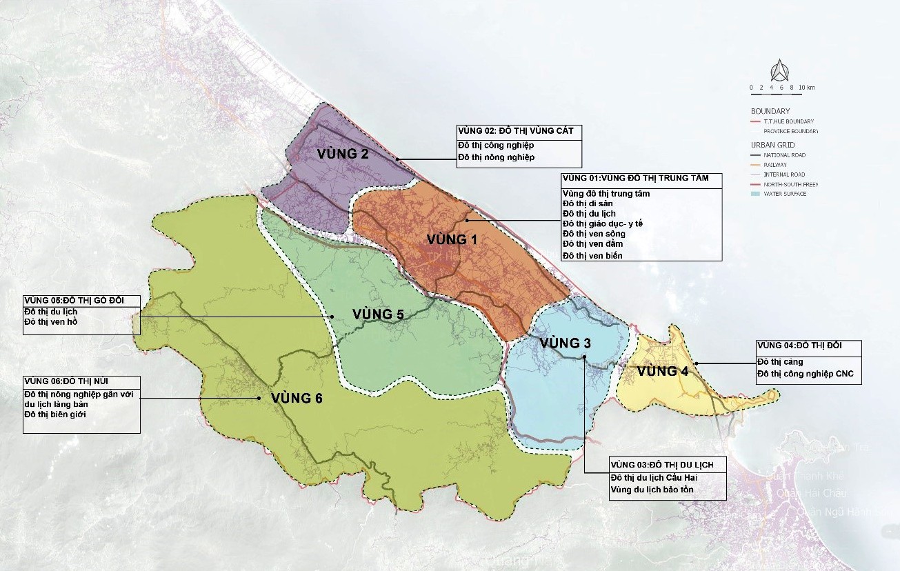 Dự thảo báo cáo đầu kỳ công tác quy hoạch cũng cho biết, dựa theo điều kiện tiềm năng phát triển của mỗi khu vực có thể phân ra thành 6 vùng. Vùng 1 là đô thị trung tâm với chức năng đô thị di sản, đô thị du lịch, đô thị giáo dục y tế, đô thị ven sông, đô thị ven đầm; vùng 2 là đô thị vùng cát gồm đô thị công nghiệp, đô thị nông nghiệp; vùng 3 là đô thị du lịch với đô thị Cầu Hai, vùng bảo tồn Bạch Mã; Vùng 4 là đô thị đôi gồm tổ hợp đô thị du lịch- dịch vụ- logistic- đô thị; vùng 5 là đô thị gò đồi, đô thị ven hồ; vùng 6 là đô thị núi sẽ phát triển du lịch nông nghiệp gắn với làng bản, du lịch đô thị vùng biên.