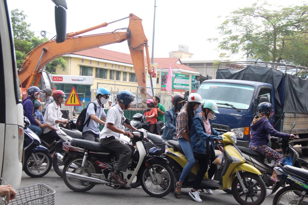 Kẹt xe giờ cao điểm đoạn đường thi công ngã tư Nguyễn Huệ - Nguyễn Trường Tộ