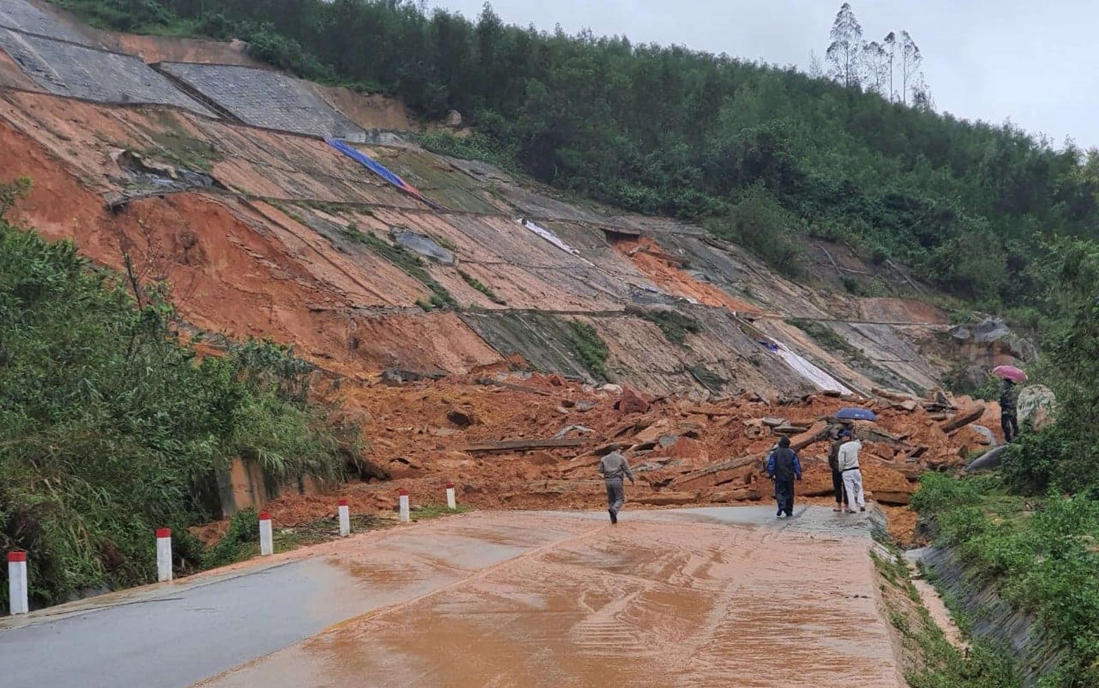 Theo quan sát của chúng tôi, một phần lớn bờ kè taluy dương trên tuyến đường đã bị sạt lở hoàn toàn và có nguy cơ tiếp tục sạt lở, việc thông tuyến gặp nhiều khó khăn, trở ngại đối với người và phương tiện thi công.