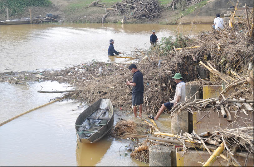 Tại đập La Ỷ (Phú Thượng, Phú Vang), những ngày này, công nhân của Trạm thủy lợi La Ỷ đang xử lý, khơi thông rều rác, vật nổi ở hạ nguồn thân đập để khơi thông dòng chảy, giúp tiêu thoát lũ cho hệ thống sông, hói trong khu vực.