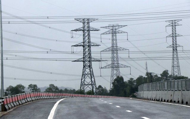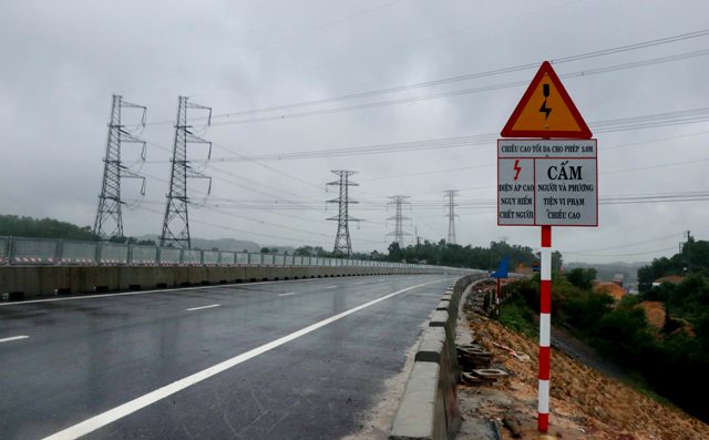 Đoạn đường điện cao thế bắc qua đường cao tốc vẫn chưa di dời nên nhà thầu phải cắm biển báo cấm người và phương tiện vi phạm chiều cao