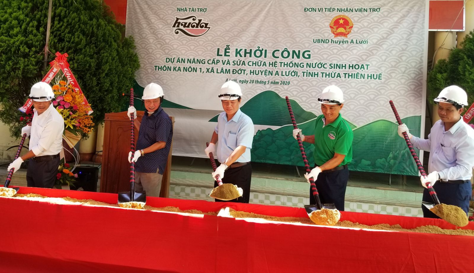 Phó Chủ tịch UBND tỉnh Nguyễn Văn Phương (giữa) cùng lãnh đạo Huda và huyện A Lưới thực hiện nghi thức khởi công dự án