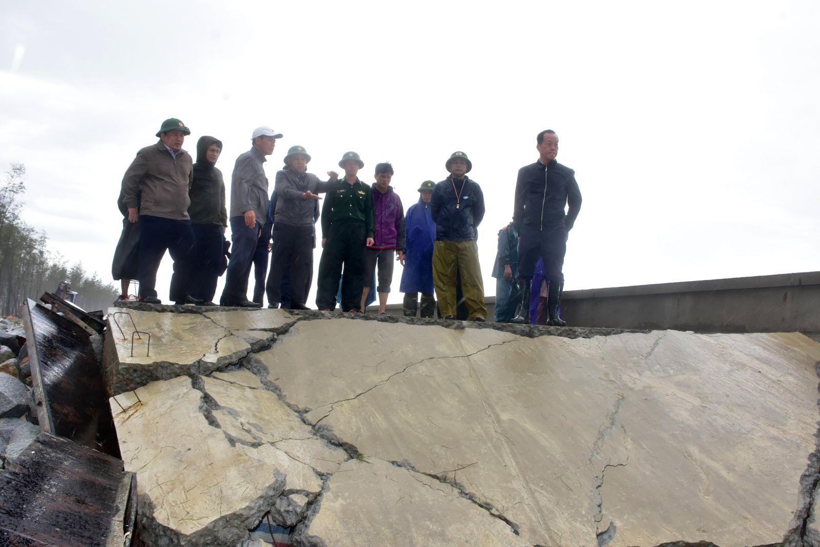 Kiểm tra tại tuyến bờ biển xã Giang Hải, huyện Phú Lộc, do sóng to, gió lớn kết hợp với triều cường đã làm sạt lở khoảng 250m đoạn bờ kè đang thi công. Chủ tịch UBND tỉnh hoan nghênh chính quyền sở tại đã nỗ lực huy động các lực lượng, phương tiện hỗ trợ công tác gia cố đê kè nhằm giảm thiểu sạt lở tại các bờ biển.