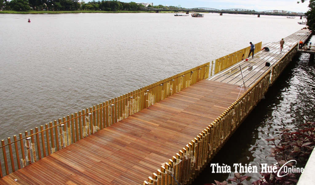 Một đoạn đường nằm trong tuyến đường dọc sông Hương hoàn thiện với sàn lát gỗ đẹp mắt