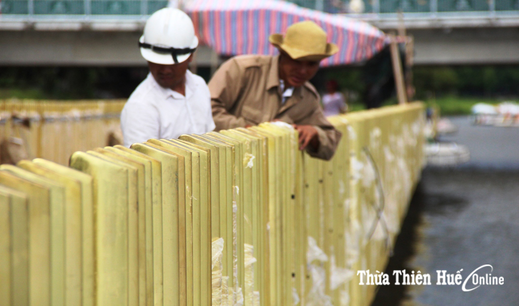 Khâu lắp ráp lan can cũng khá tốn kém thời gian. Trong ảnh, công nhân phải đứng ở phuy nổi trên sông để lắp ráp