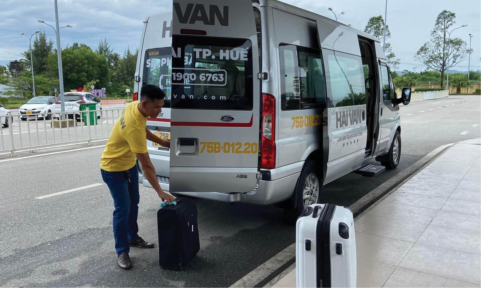 Xe buýt Hải Vân đang vận hành thí điểm đưa đón khách từ Cảng HKQT Phú Bài lên TP. Huế và ngược lại