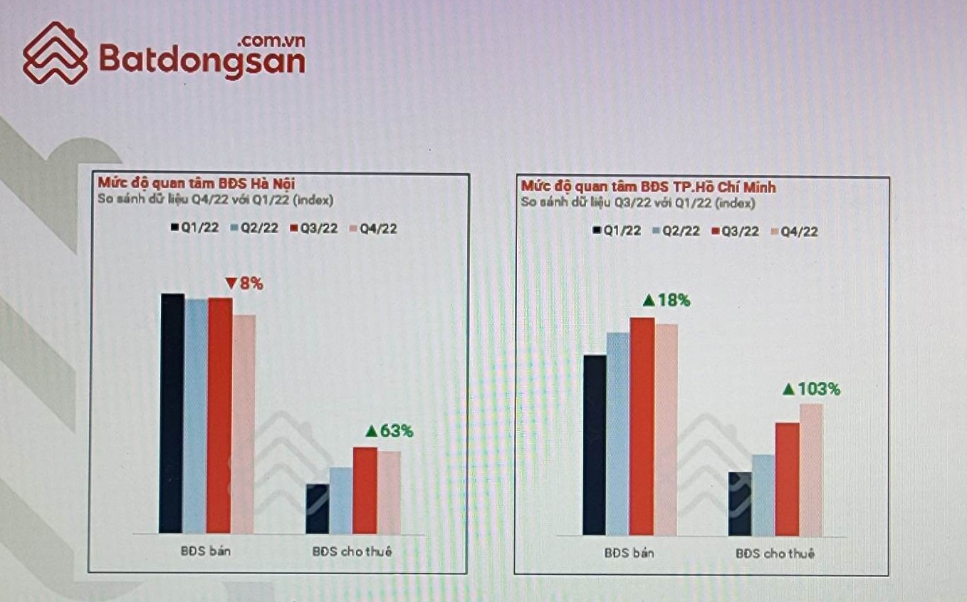 Từ đầu năm 2022, BĐS khu vực miền Nam, đặc biệt là tại TP Hồ Chí Minh đang chứng kiến lượng quan tâm tăng mạnh hơn so với nhiều tỉnh phía Bắc. Trong quý IV/2022, lượt tìm mua BĐS tại TP Hồ Chí Minh ước tính tăng 18% so với quý I/2022, trong khi con số này của Hà Nội lại giảm 8%. Nhu cầu tìm thuê BĐS ở cả 2 thành phố đều hồi phục tốt trong năm 2022, nhưng TP Hồ Chí Minh chứng kiến tốc độ hồi phục mạnh mẽ hơn, với mức độ quan tâm tới BĐS cho thuê tăng 103% so với đầu năm, trong khi Hà Nội tăng 63%.