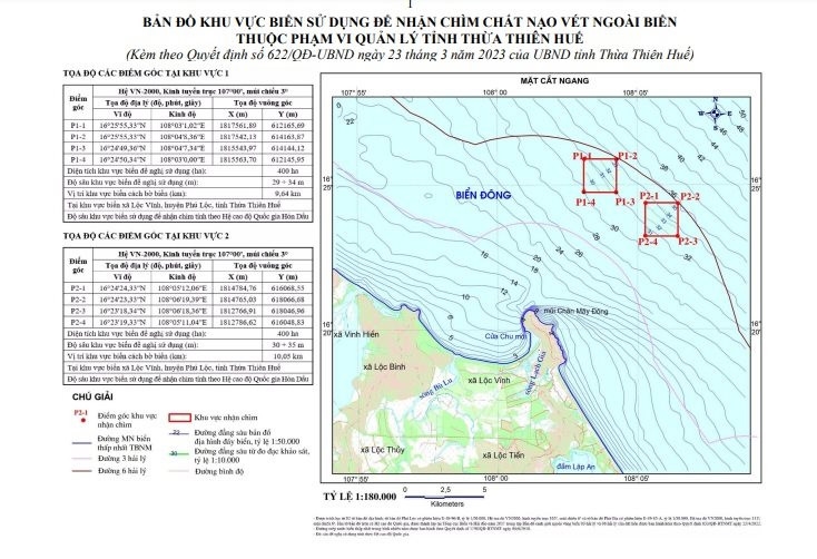 Theo đó, 2 khu vực được phê duyệt nằm tại vùng biển xã Lộc Vĩnh (huyện Phú Lộc) với tổng diện tích 800 ha. Khu vực 1 có diện tích 400 ha, độ sâu từ 29 m đến 34 m tính từ mức “0” hệ cao độ Quốc gia. Khu vực 2 có diện tích 400 ha, độ sâu từ 30 m đến 35 m tính từ mức “0” hệ cao độ Quốc gia.