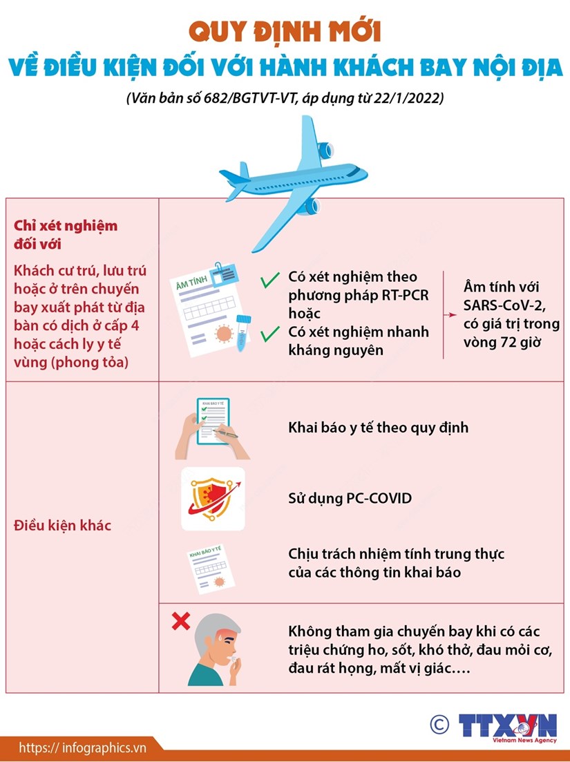 Từ 22/1/2022, chỉ những hành khách cư trú, lưu trú trước chuyến bay hoặc xuất phát từ cảng hàng không tại địa bàn có dịch ở cấp 4 hoặc cách ly y tế vùng (phong tỏa) mới phải có kết quả xét nghiệm âm tính với SARS-CoV-2 có giá trị trong vòng 72 giờ kể từ thời điểm lấy mẫu xét nghiệm đến trước thời điểm khởi hành chuyến bay.