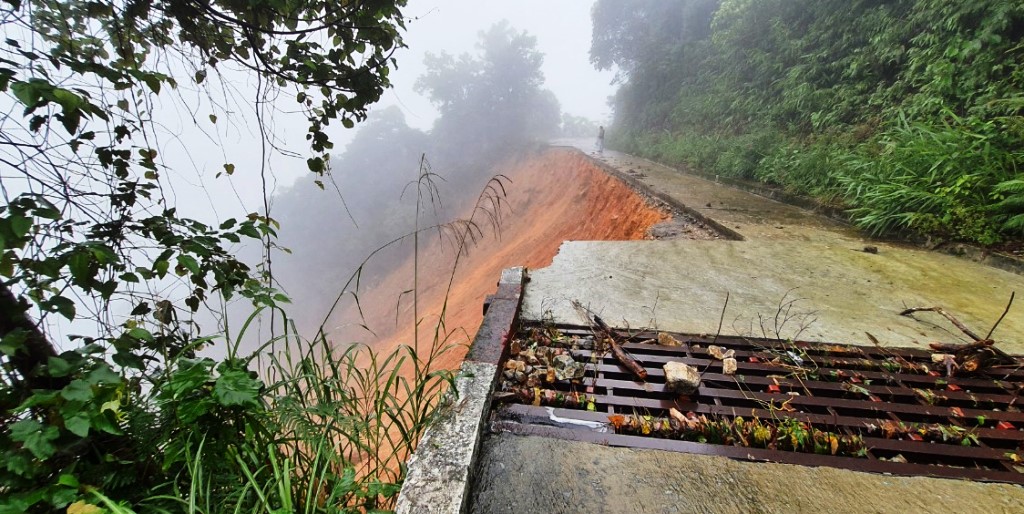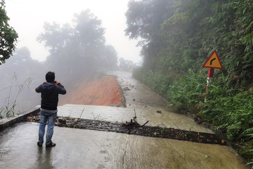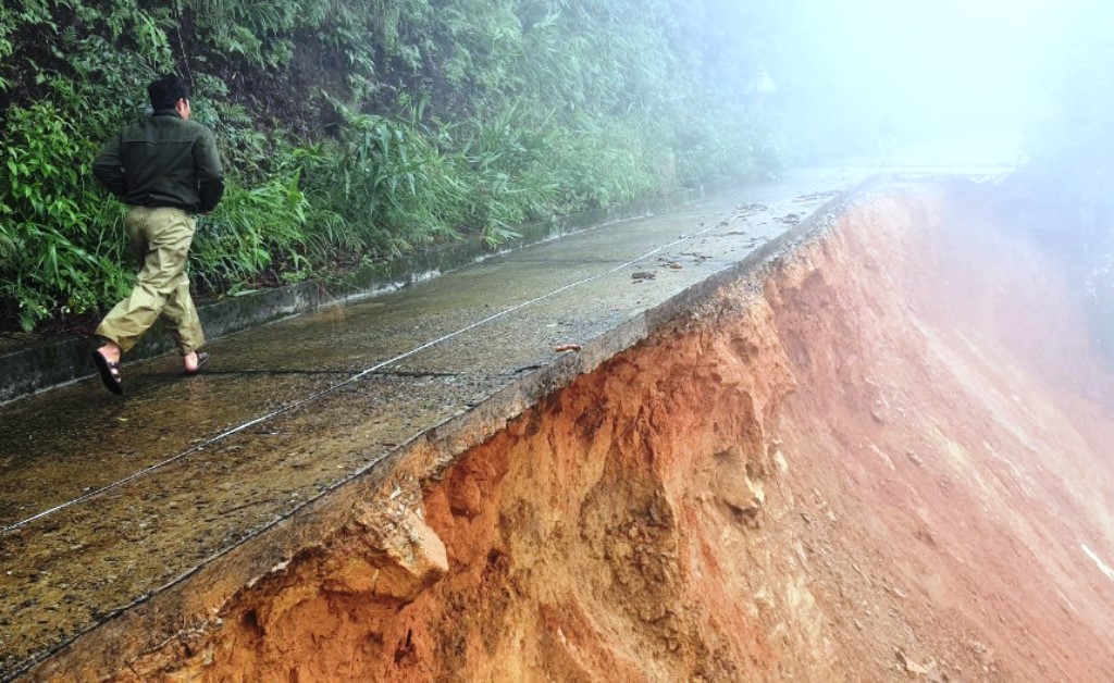 Có thể thấy rõ sạt lở đã "ăn" 1/2 bề mặt đường