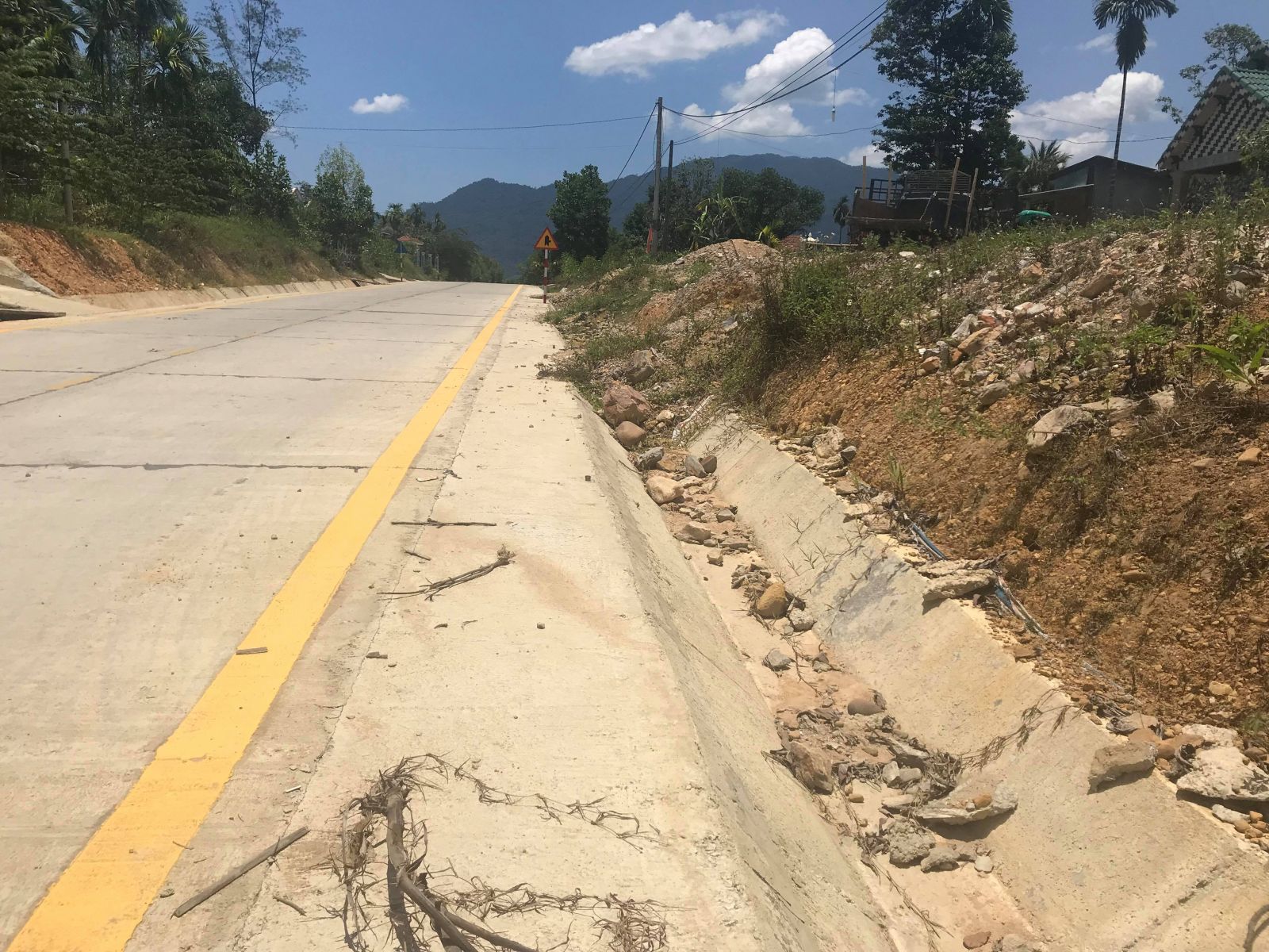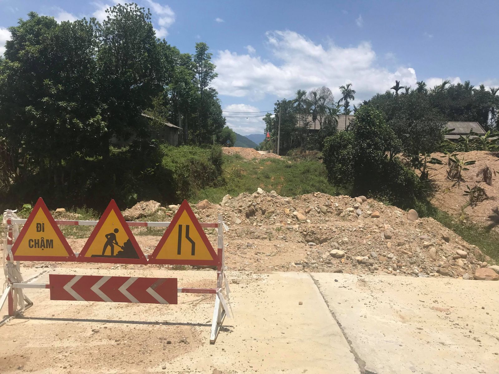Tại hiện trường còn khoảng 150m đường dẫn lên cầu Hương Hòa vẫn còn ngổn ngang đất đá, cây cối mọc um tùm. Đơn vị thi công đã đặt biển cảnh báo công trình thi công ngằm cảnh báo giao thông cho người đi đường do đoạn này chưa thông tuyến được. Trên tuyến còn một số máy móc của nhà thầu thi công phơi mưa nắng trong nhiều tháng nay. Cạnh đó, các mương thoát nước hai bên tuyến đường tránh thị trấn Khe Tre bị các hộ dân san lấp mương để lấy lối đi lên nhà, gây nguy cơ ngập úng trong mùa mưa lũ. Theo thiết kế của dự án, đoạn này sẽ được đắp đất dày 50cm, đá dăm cấp phối 18cm gia cố xi măng và xây dựng hệ thống cống ở bên dưới.