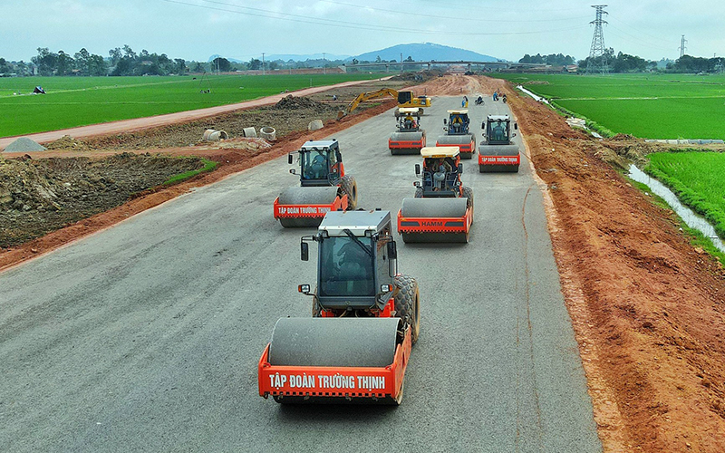 Nhà thầu Tập đoàn Trường Thịnh triển khai thi công lu lèn lớp K95 thuộc dự án cao tốc bắc-nam qua địa bàn tỉnh Thanh Hóa.