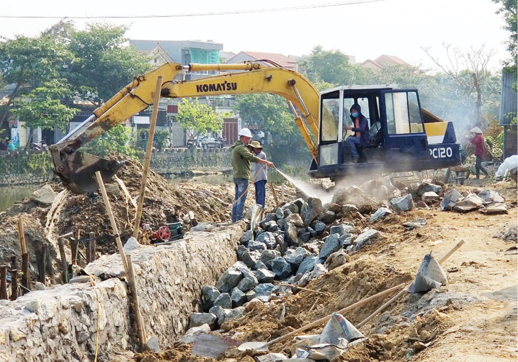 Tại hạng mục kè An Cựu thuộc gói thầu trên, hiện đơn vị thi công đang triển khai đúc bê tông móng và xây dựng chân kè đá hộc được 114m trên tổng chiều dài 460m, đạt tiến độ 25% giá trị các hạng mục.