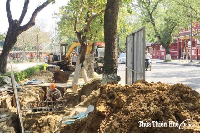 Nhiều người đặt câu hỏi: Tại sao các đơn vị thi công không chọn giải pháp thi công ở lòng đường để giảm ảnh hưởng đến cây xanh, nhất là những cây cổ thụ, có tuổi thọ hàng trăm năm? Ban quản lý dự án Cải thiện môi trường nước TP. Huế khẳng định: "Nguyên tắc thi công các hạ tầng kỹ thuật, bao gồm các loại cáp viễn thông, cấp thoát nước đều phải thực hiện trên vỉa hè, vừa thuận lợi trong quản lý vận hành với tầm nhìn hàng chục năm sau, vừa tránh ảnh hưởng đến giao thông; chỉ những tuyến đường vỉa hè nhỏ hẹp hoặc không có vỉa hè mới buộc phải thi công xuống lòng đường".